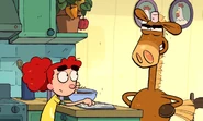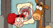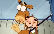 - Gray horse t-shirt, pink shorts with red polka dots, white socks
