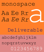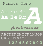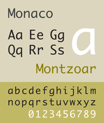 | List of typefaces | 3x3 · Andalé Mono · Consolas · Courier (New) · DejaVu Sans Mono · Droid Sans Mono · Everson Mono · Fira Mono · Fira Code · Fixed · Fixedsys · HyperFont · IBM Plex Mono · Inconsolata · Letter Gothic · Liberation Mono · Lucida (Console · Sans Typewriter · Typewriter) · Menlo · Monaco · Monospace · MS Gothic · MS Mincho · Nimbus Mono L · OCR-A (OCR-B) · PragmataPro · Prestige Elite · ProFont · Roboto Mono · SimHei · SimSun · Source Code Pro · Terminal · Ubuntu Mono · Vera Sans Mono |
